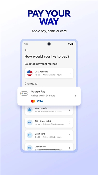 • Fund your transfers your way through bank deposits, ACH, credit or debit cards, and mobile wallets.