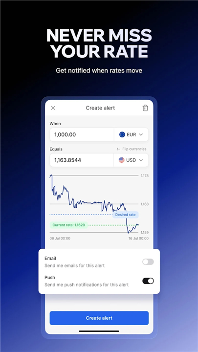 • Set personalized rate alerts to ensure you never miss the perfect moment to convert.