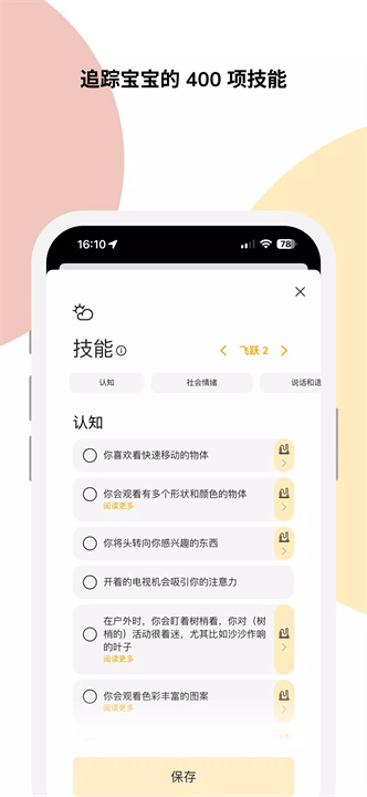 技能发展跟踪:了解宝宝在每次飞跃期内将学会的新技能,帮助您为宝宝的成长提供针对性的支持。