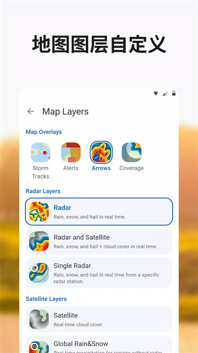 应用的核心功能是其动态雷达地图,用户可以直观地查看周围地区的降雨、降雪和风暴活动。这一功能让用户能够随时跟踪天气变化,确保不再被突如其来的恶劣天气打扰。而且Rain Viewer 的全球雨雪覆盖功能使得即使在没有雷达覆盖的偏远地区,用户也能通过卫星数据获取实时降水信息。这对于经常出差或旅行的人尤其重要,无论用户在哪里,都能获得准确的天气预报。