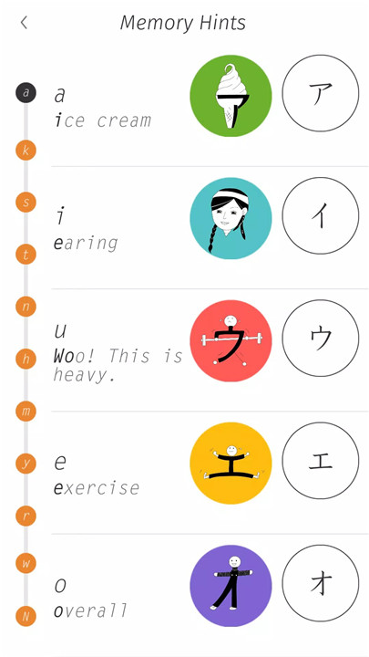 Katakana Memory Hint [English], a fun and engaging tool for learning katakana. Whether you're a complete beginner in Japanese or simply interested in Japanese letters, this app is designed to make your learning experience enjoyable and effective.