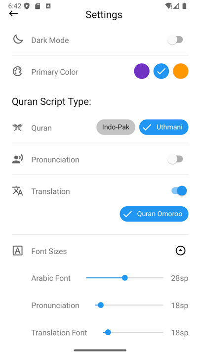 • Choose between Indo-Pak or Usmani scripts, with additional Latin transliteration options for support in recitation.