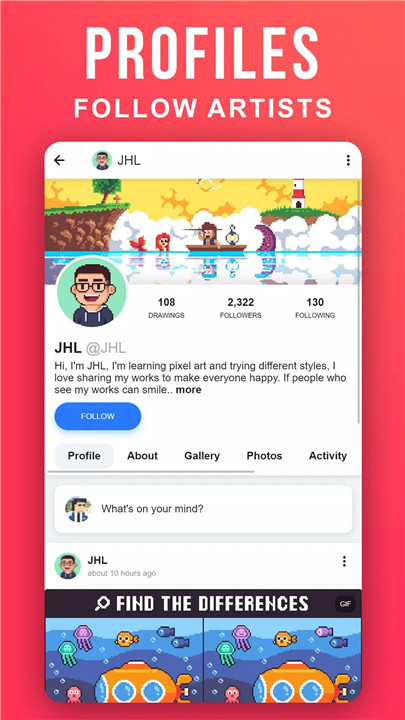 Engage with other users by receiving notifications for likes, comments, mentions, and new followers. Follow your favorite artists to stay updated with their latest works and activities through personalized feeds.