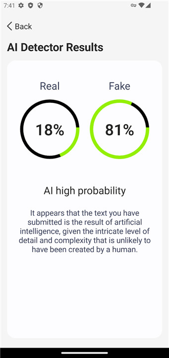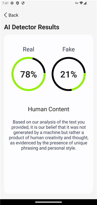 The AI Detector features a sleek and user-friendly interface. On the results page, you'll find a straightforward design that shows the percentage of AI-generated content detected, enabling you to quickly assess the authenticity of the text you’re reviewing. With our app’s intuitive layout, you can expect accurate and dependable results every time.