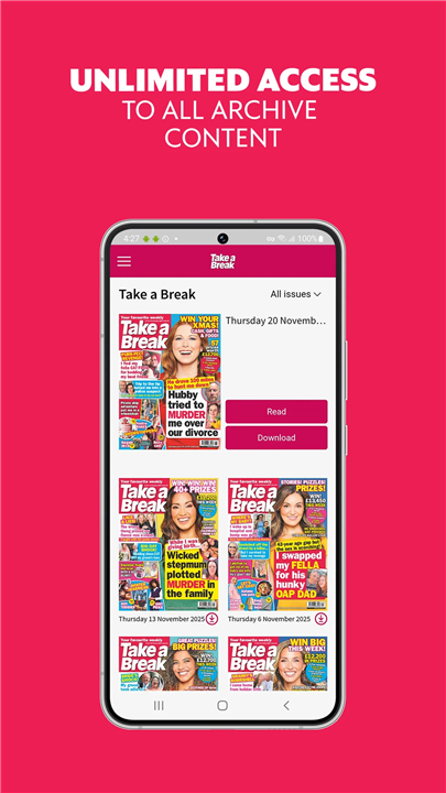 • The Take a Break app gives you instant access to every issue, plus a treasure trove of past editions – all designed to look fantastic on your screen.
