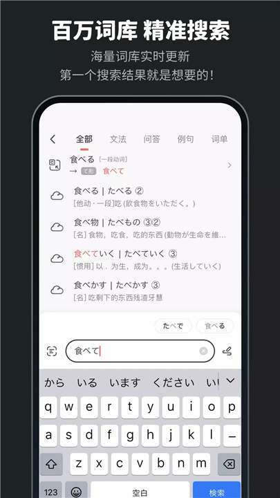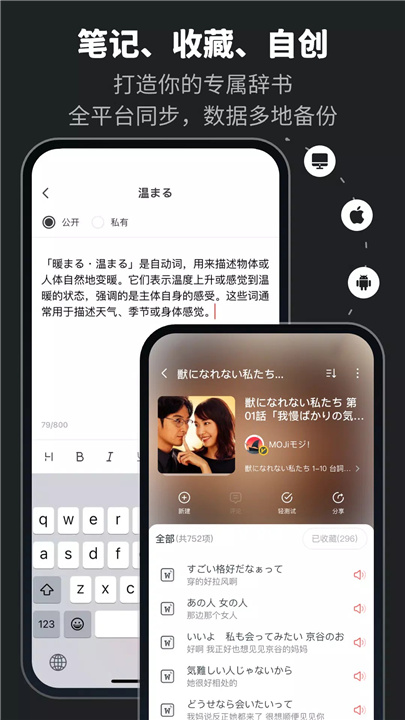 MOJi辞書拥有精选的日语词汇,细致划分各类主题,让您畅享便捷的在线查询功能,轻轻一点便可快速找到所需词语并轻松下载收藏,与此同时,云端数据同步功能确保了您随时随地打开手机都能获得最新信息。