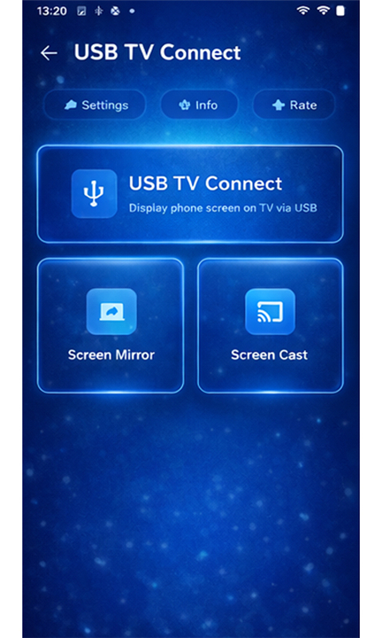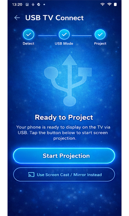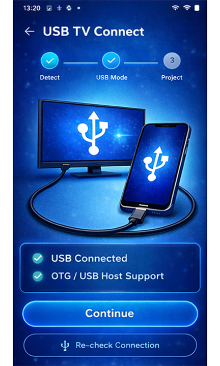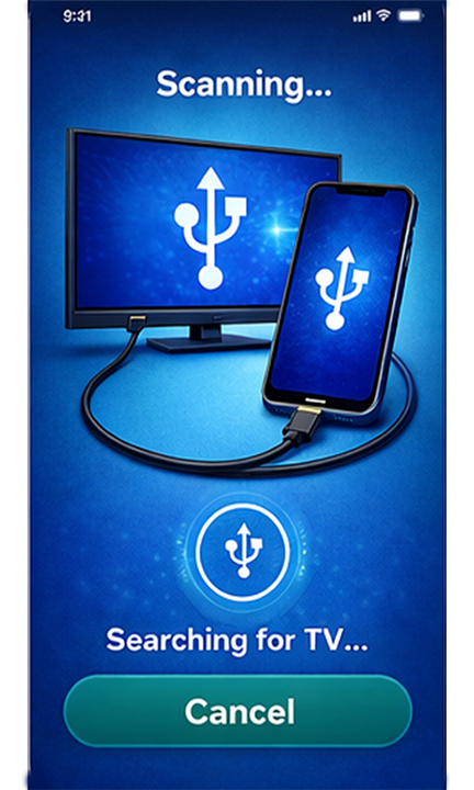 • The "USB Connect - TV Share Screen" application offers an intuitive and effective solution for projecting your smartphone's content onto a larger television display.