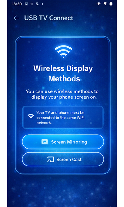 A: The app fully supports a seamless wireless connection mode for those who prefer convenience and freedom of movement. This allows you to cast your screen and share content quickly without being tethered to the TV, which is perfect for casual sharing or when you need to use your phone as a remote from across the room.