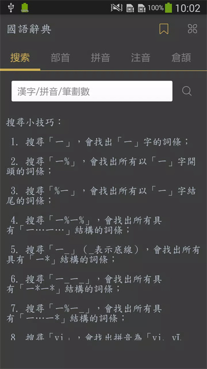 [國語辭典]是一款免费、离线可用的汉语辞典工具,包含丰富的汉字与词条信息,共收录2万多个国际标准汉字及15万多个词条,为用户提供详尽的汉字解释和词汇信息。支持多种搜索方式,包含精确查找、模糊搜索、拼音检索及笔划筛选等多种功能,帮助用户轻松查找所需内容。独特的搜索模式让用户能够根据词条结构、拼音声调或笔划数等条件进行精确查询,适合各类汉语学习和日常使用需求。一键查字,掌握汉语知识的好帮手。