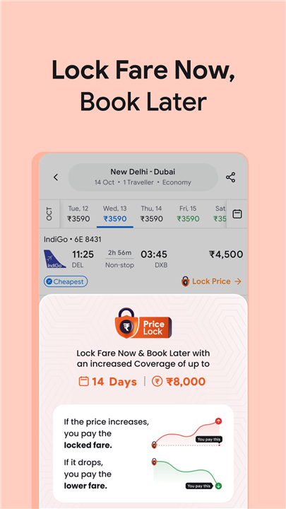A: Price Lock is a handy feature that lets you secure today’s flight fare for up to 14 days by paying a small fee. If the price goes up later, you’ll pay the locked-in rate. If the price drops, you’ll be charged the new lower fare, ensuring you never lose out on savings.