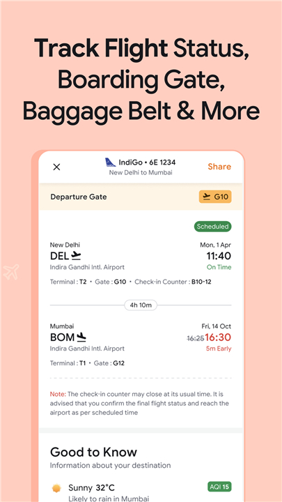 • Live Flight Tracker: Stay updated with real-time status, delays, and cancellations.