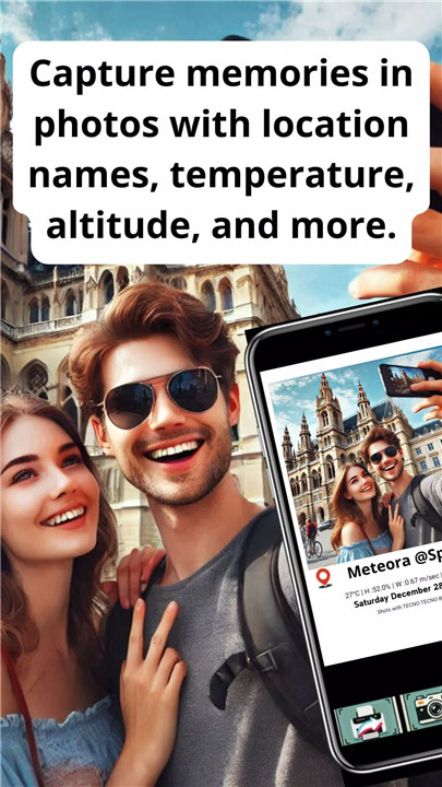 When you take a photo with Checkin Camera, it automatically embeds important details about your location, such as the name of the place, weather conditions, altitude, and GPS coordinates. This ensures that every photo tells the full story of where you were, creating rich, memorable images.