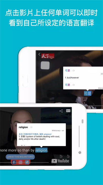点击字幕中的单字即可查看翻译和定义。