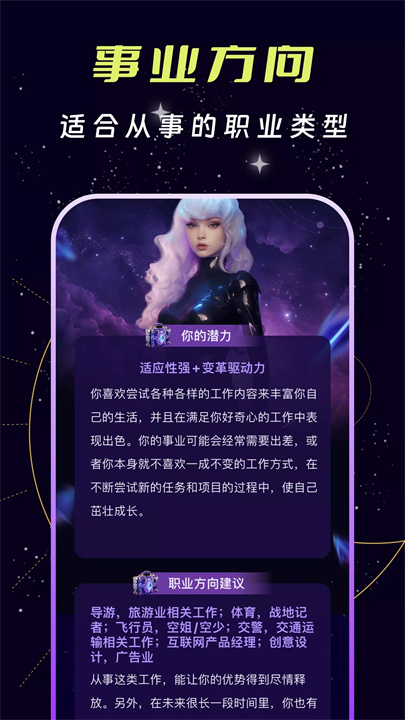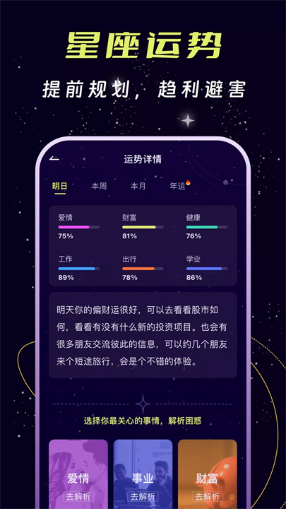 [测吖]是一款帮助用户做出明智决策的应用,提供最佳时机和方向的建议。在感情上,它帮助您预测脱单时机,分析关系中的潜在问题;在职业规划上,测吖预测升职、转职和投资机会,让您提前准备,抓住机会。通过星座配对、流年运势等功能,它帮助用户了解未来的走势,提升决策的准确性。知未来,规划现在。