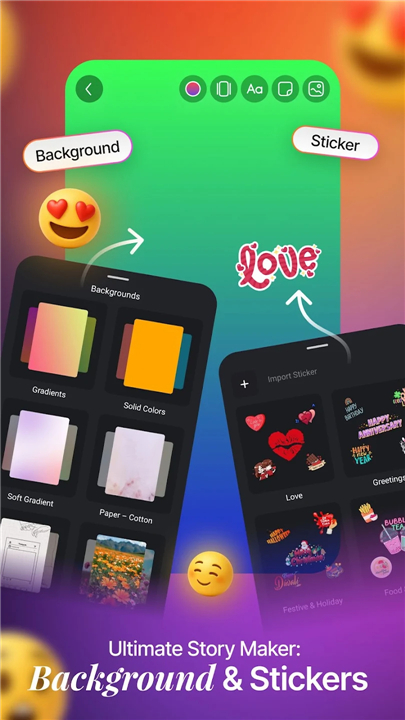 • Dynamic Visuals: Infuse life into your designs with rich background options. Choose from custom colors, stunning gradients, or integrate your text and emojis seamlessly onto your own images.
