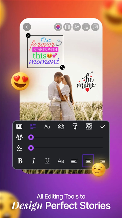 • Expressive Text Styles: Dive into a diverse gallery of font styles to perfectly match the mood and message of your story. Enter your own text and effortlessly change its appearance.