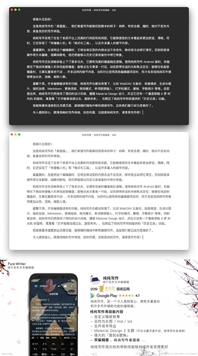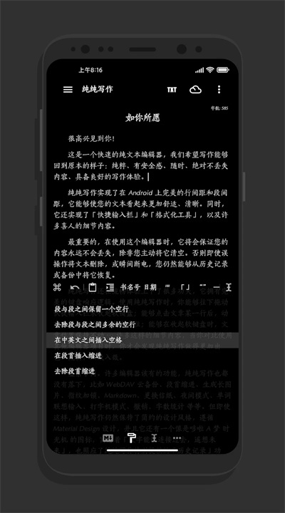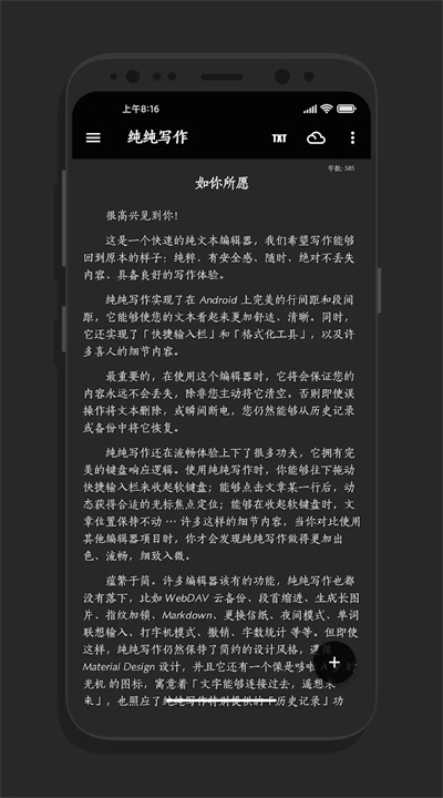 纯纯写作在设计上遵循 Material Design,简约而美观。应用内集成了多项实用功能,如快捷输入栏、多设备云同步、字数统计及 TTS 语音引擎,让您的创作过程更加轻松。通过“查找替换”、一键调整格式等功能,您可以迅速编辑和整理文本,提升工作效率。