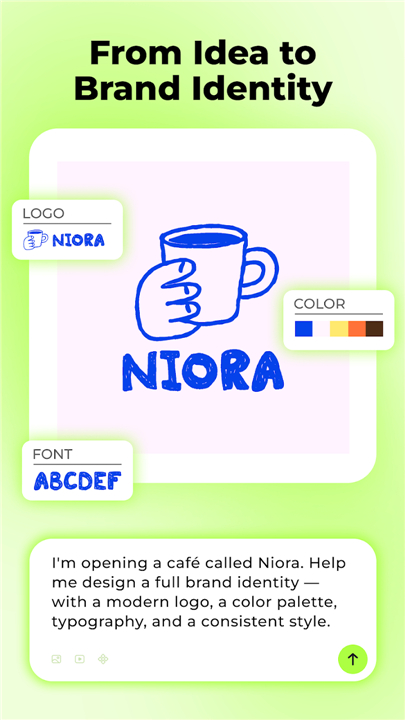 • Instantly generate a complete brand kit—logos, color palettes, fonts, and style assets.