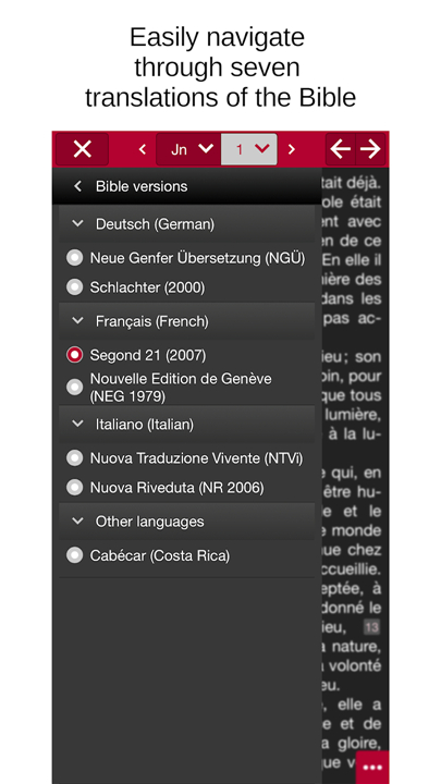 A: You can choose from several high–quality translations. In French, you’ll find Segond 21, which balances modern language with fidelity to the original, and the literary Nouvelle Édition de Genève. German speakers can access the clear, contemporary Neue Genfer Übersetzung alongside the more traditional Schlachter 2000. Italian users have both the conversational Nuova Traduzione Vivrente and the time–tested Nuova Riveduta. There’s even a minority‐language option, the Cabécar Bible from Costa Rica, supporting indigenous‐language preservation.