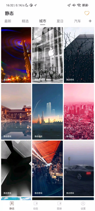 超过10种主题分类,包括精选、城市、夏日、自然、汽车、科技等,总能找到契合心情或场景的壁纸。