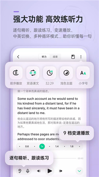 轻听英语下载还支持自由调节播放速度,配备线控跟读功能,同时还具备生词查询功能,特别针对听力难点和句型盲点进行重点攻克,助力您在英语学习道路上不断突破自我,取得更加优异的成绩!