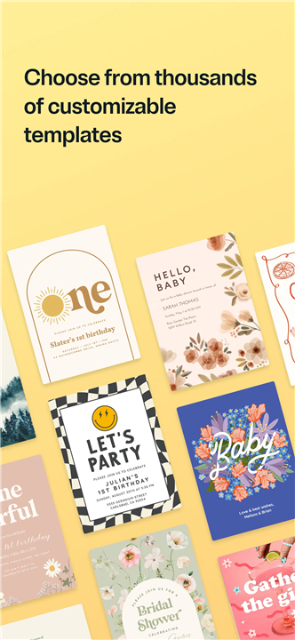 • Personalize free templates with photos from your own gallery, or fully customize Premium invites with matching envelopes.