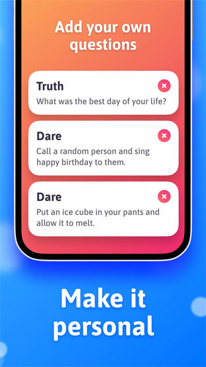 游戏内置数百个独特且富有创意的真心话和大冒险任务,涵盖幽默、挑战和深度的问题,让你在轻松中揭开朋友们不为人知的一面。