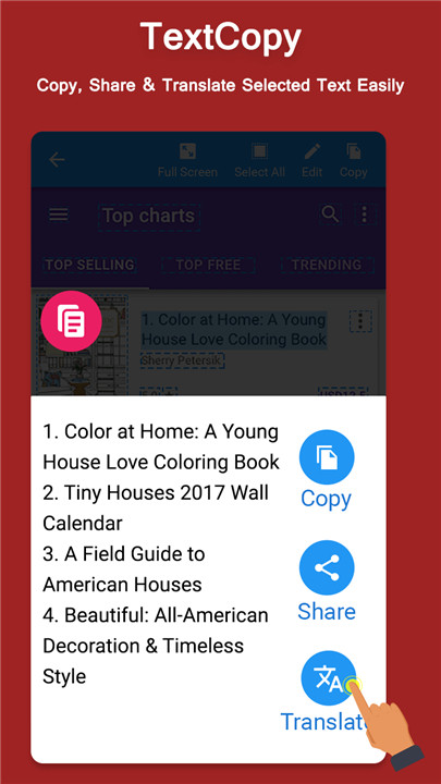With just a single click on any item, the text is automatically copied for you. You can then paste it wherever you need without the hassle of tapping repeatedly. Simply select the text using this handy tool, and you can easily paste, share, or translate it with the Textcopy app.