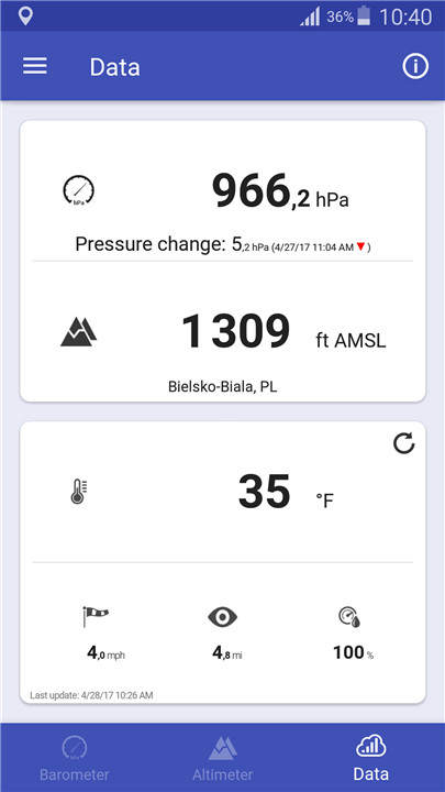Check accurate Atmospheric pressure and Altitude wherever you are! Download the latest version of Barometer & Altimeter 2.7.00 to enjoy new features and updates immediately!