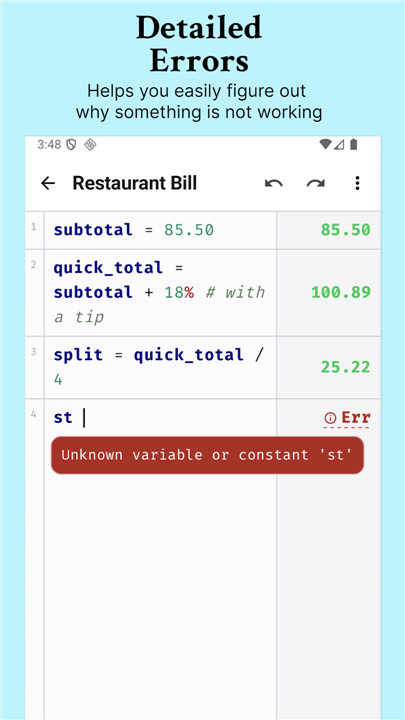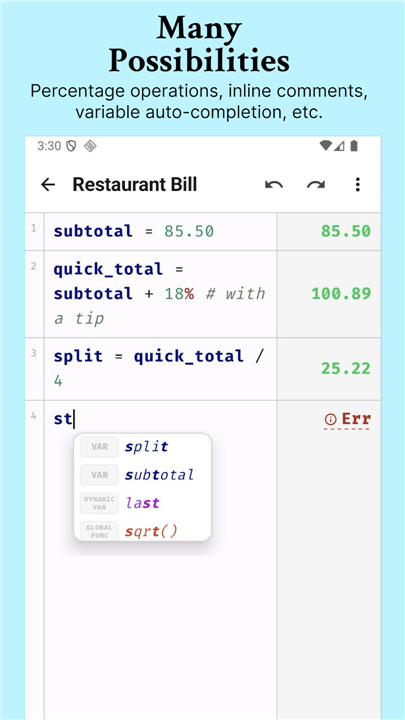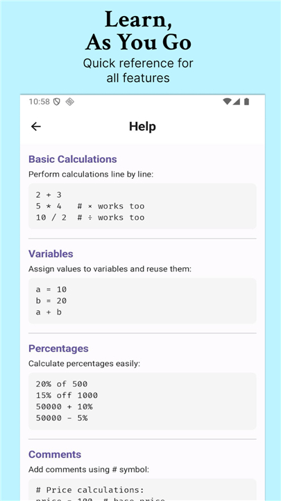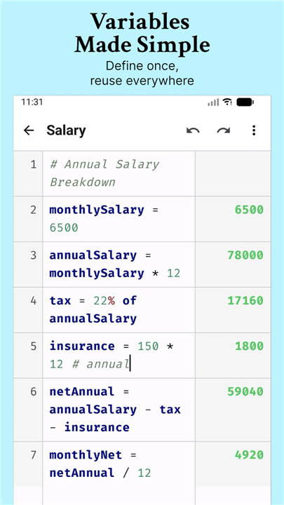 A: While a standard calculator typically loses your history as soon as you clear the screen, NerdCalci treats your calculations like a living document where you can go back and edit any line at any time. It lets you add comments to explain your reasoning and use custom variables so that your math looks more like a clear story rather than a jumble of disconnected numbers.