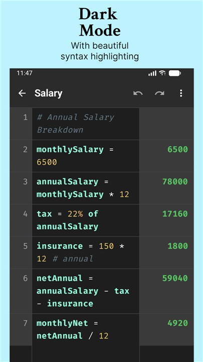 • Read your work clearly with syntax highlighting and line numbers.