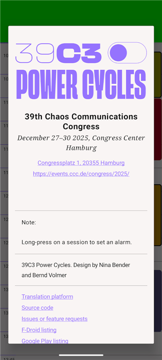 The 39C3 Schedule app (Dec 27-30) for the CCC in Hamburg on your Android device Download the latest version of 39C3 Schedule to enjoy new features and updates immediately!