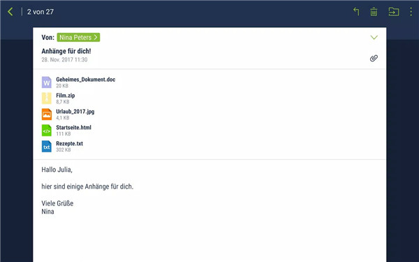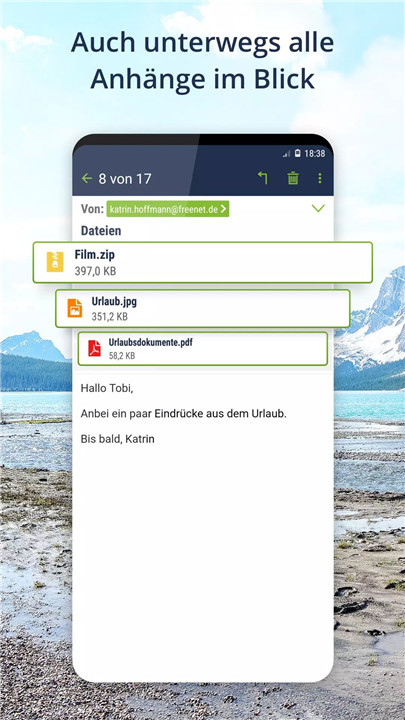 Managing your emails is simple with Freenet Mail. You can easily open, forward, and store email attachments like photos directly from the app. Plus, you have full access to all your email folders, so you can move, delete, and organize your emails just the way you want.