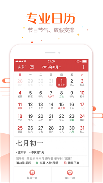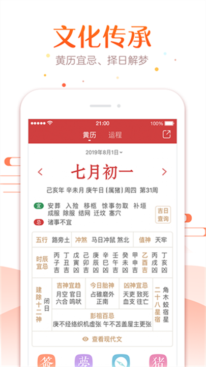 - 详细展示黄历宜忌、节日节气、吉日查询等信息,帮助用户了解当天的吉凶宜忌。