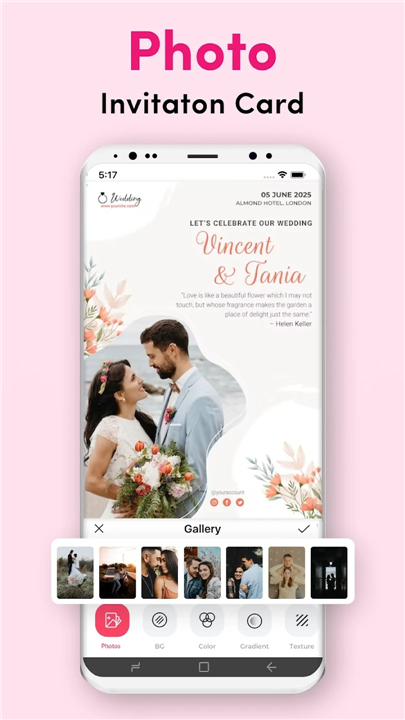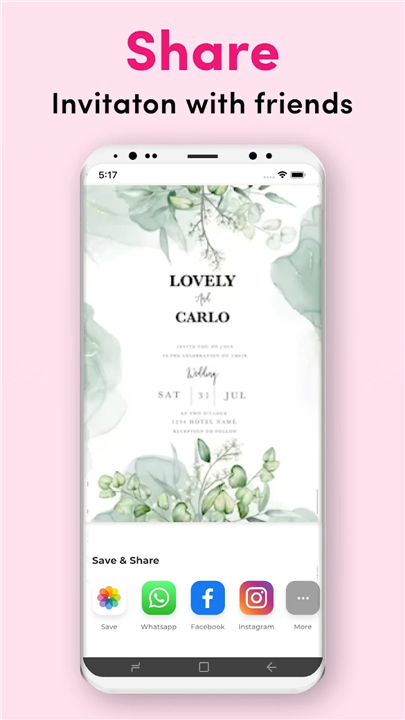 • Instant Sharing: Distribute your beautiful invitations seamlessly across social media, messaging apps, or email with just a single tap.