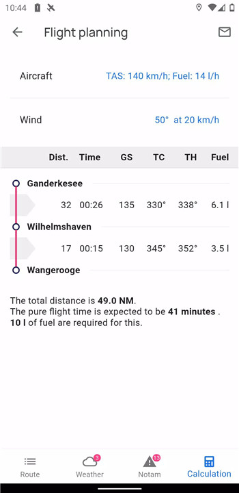 VFRnav helps pilots plan their routes efficiently. The app assists with fuel calculations, flight time estimation, and integrates weather data and NOTAMs (Notices to Airmen) for the planned route.