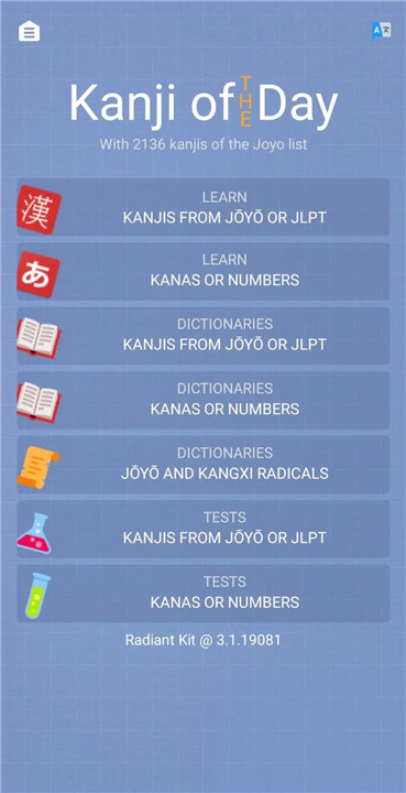 - Customize your tests based on JLPT or grade levels, covering educational kanjis (kyōiku kanji) or secondary school kanjis.