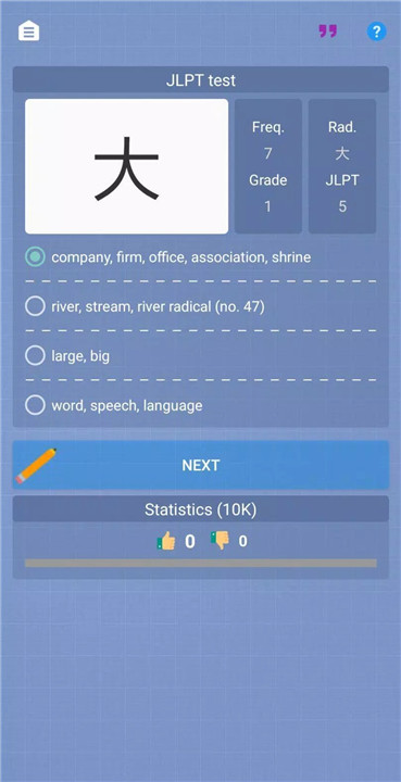 - Set the number of kanji elements for each test and track your performance and overall statistics.