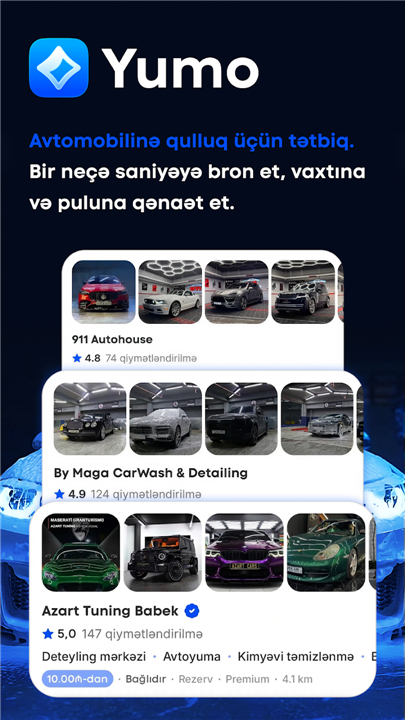 • The Yumo application empowers users to quickly locate nearby car care services or thoroughly explore options within a specific city.
