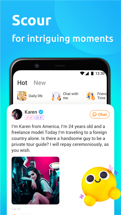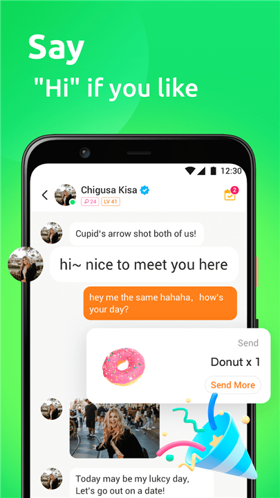 A: With the free version, you can set up your profile, browse and swipe on other users, and chat instantly by text or voice message once you’ve matched. You can also post updates about your daily life, share photos and short videos, and explore friend recommendations in your area through the home-screen widget.