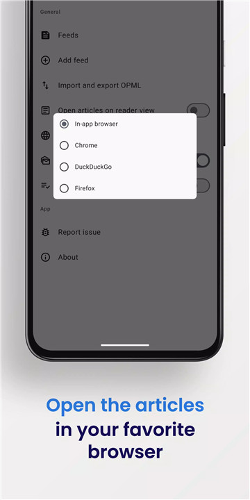 FeedFlow allows you to choose your preferred browser for opening articles. You can opt for privacy-focused browsers like DuckDuckGo or Firefox Focus to ensure your reading stays free of trackers and unwanted data collection. Alternatively, you can choose reader mode to view articles without ever leaving the app, simplifying your reading experience even further.