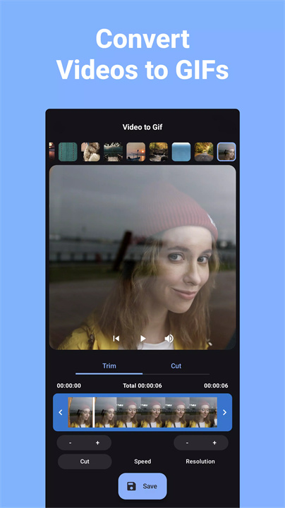 打开应用,选择视频并修剪,调整设置后,即可将视频转换为GIF。