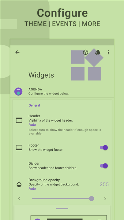 + Create and configure multiple Everyday widgets, each with its own distinct theme and calendar assignments, making it easy to differentiate and quickly identify their purpose at a glance.