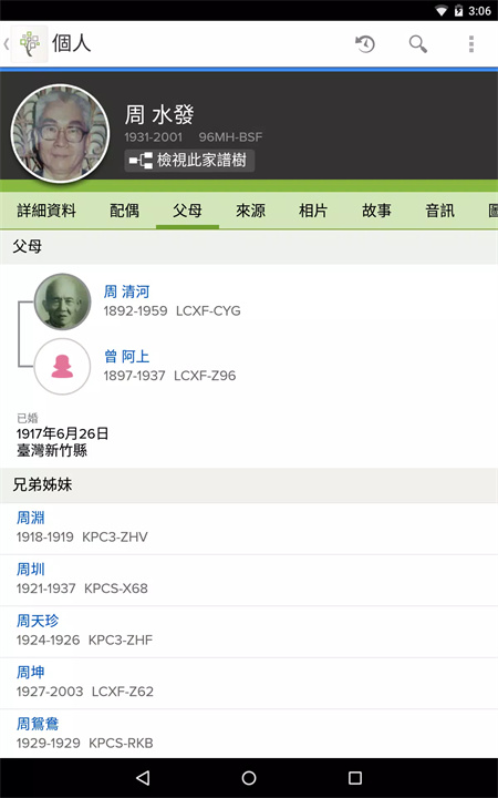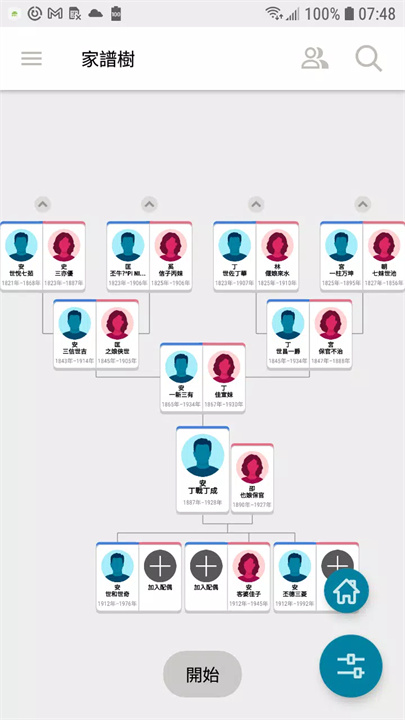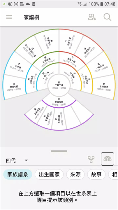 在世系表檢視畫面中,你現在可以看到更多類別和資料,以及加入配偶或子女。