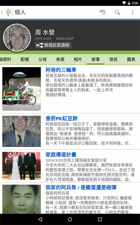 你可以添加家族成员的名字、生日、婚姻记录、去世日期以及相片、故事、文档等详细信息。