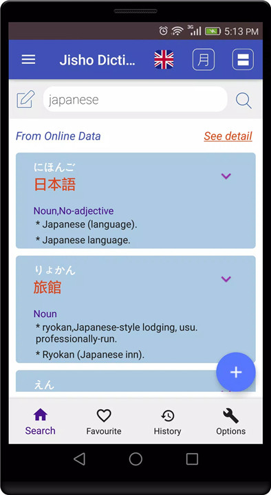- Search a wide variety of words from English to Japanese and vice versa, including romaji, kana, and kanji.