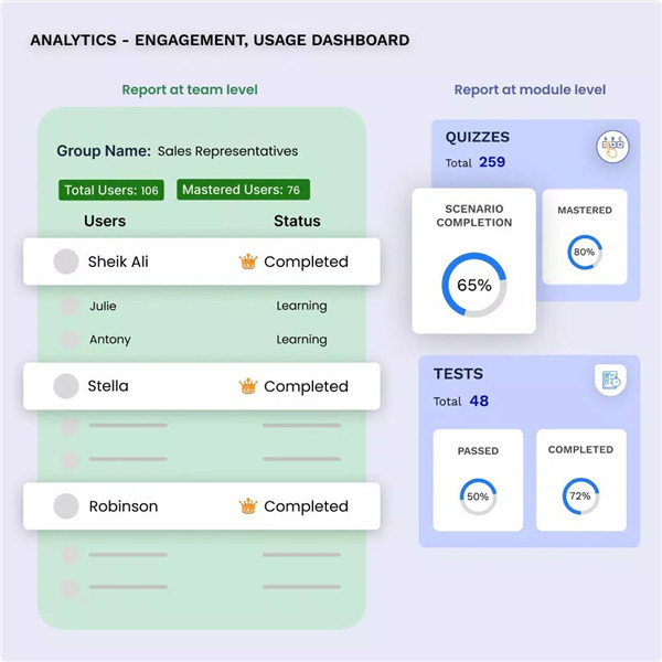 With intelligent action alerts, RapL ensures that the right information reaches the right person at the right time. Managers receive real-time insights on individual and team progress, helping them close knowledge gaps before they become performance issues.