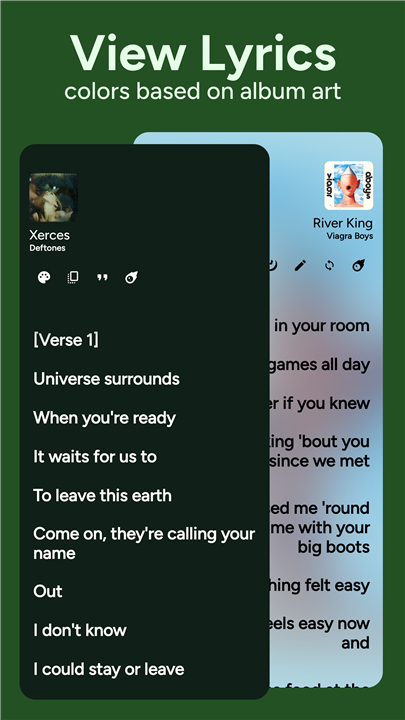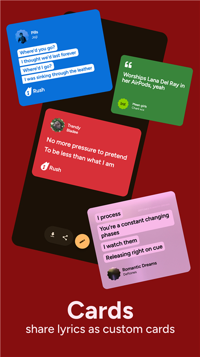 • Generate customizable lyric cards with adjustable fonts, colors, and backgrounds.