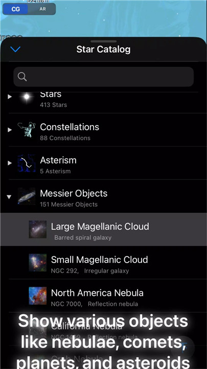 Starry Map features 88 constellations, planets, dwarf planets, over 300 comets, around 100 Messier objects, and more than 10,000 satellites.