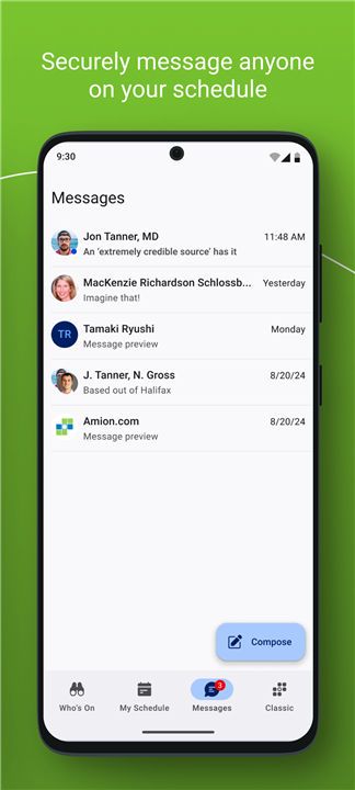 A: Absolutely. Amion uses a HIPAA-compliant messaging system to ensure that all communication remains confidential. Messages are securely delivered, notifications are protected, and you can even track when your messages have been read.